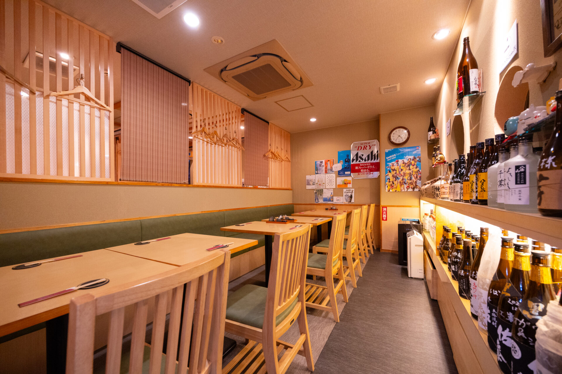 店内は肩肘張らず過ごせる木を基調とした空間で、おひとり様でも足を運びやすいカウンター席のほか、ゆったりとお過ごしいただける掘りごたつやテーブル席をご用意しております。貸切をお考えの方もお気軽にご相談ください。